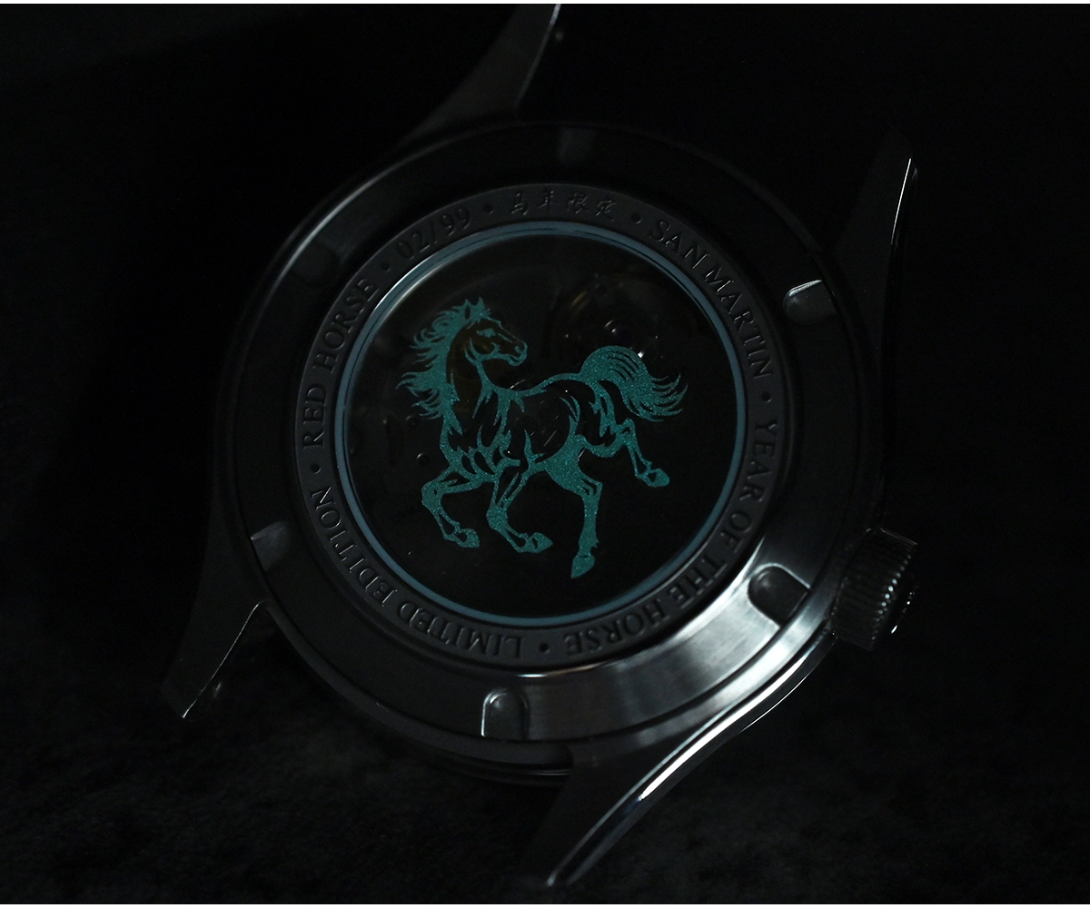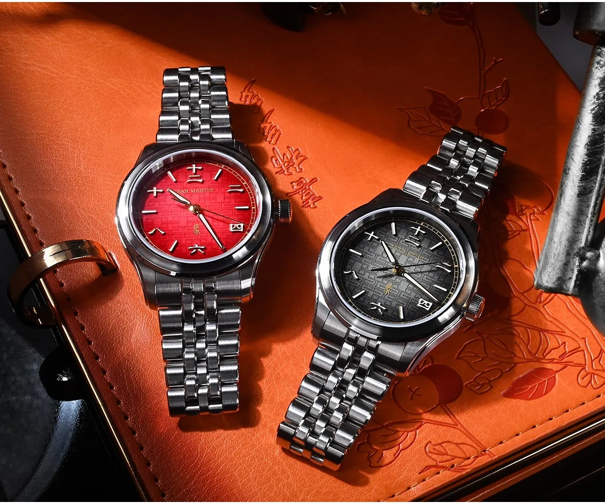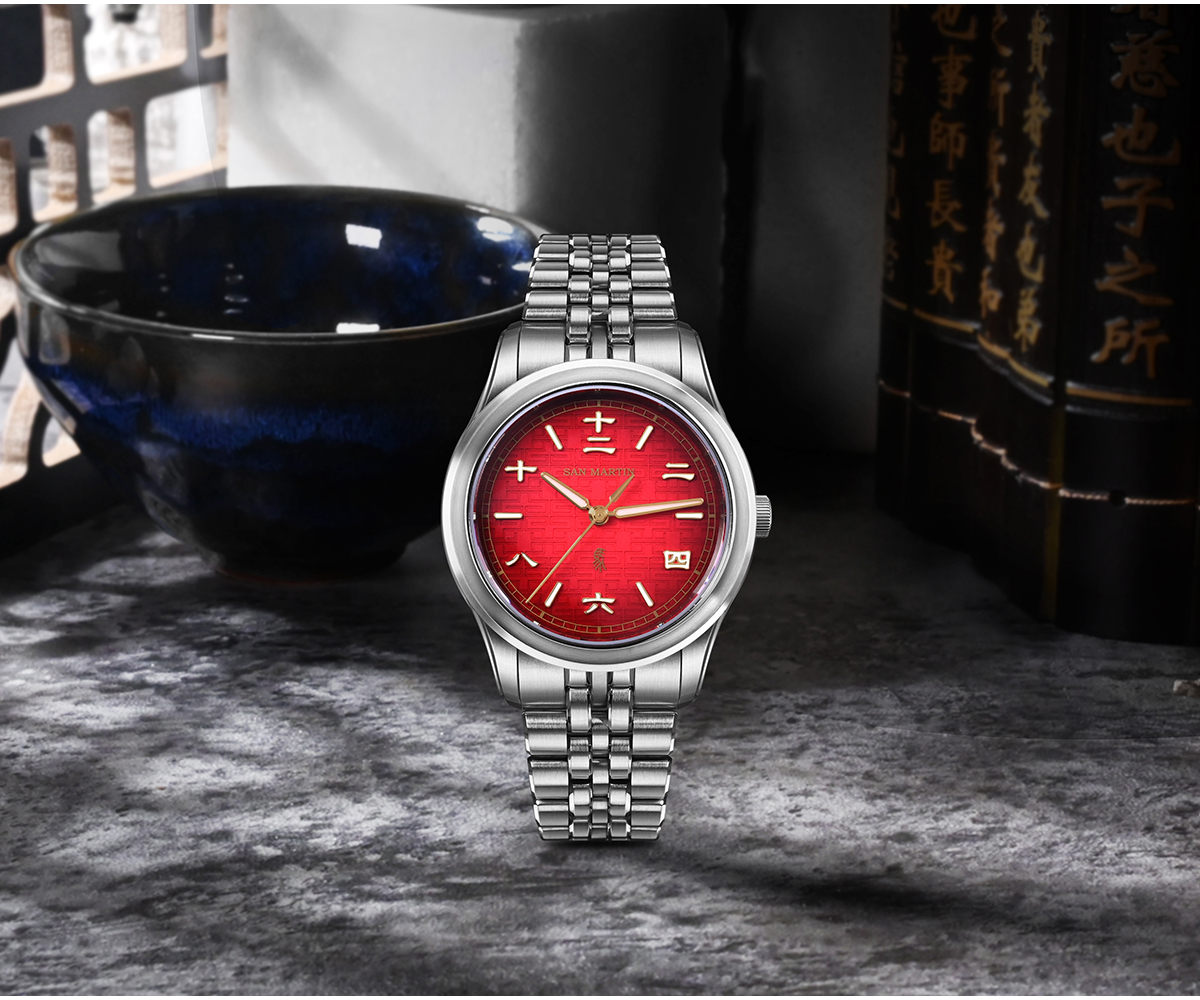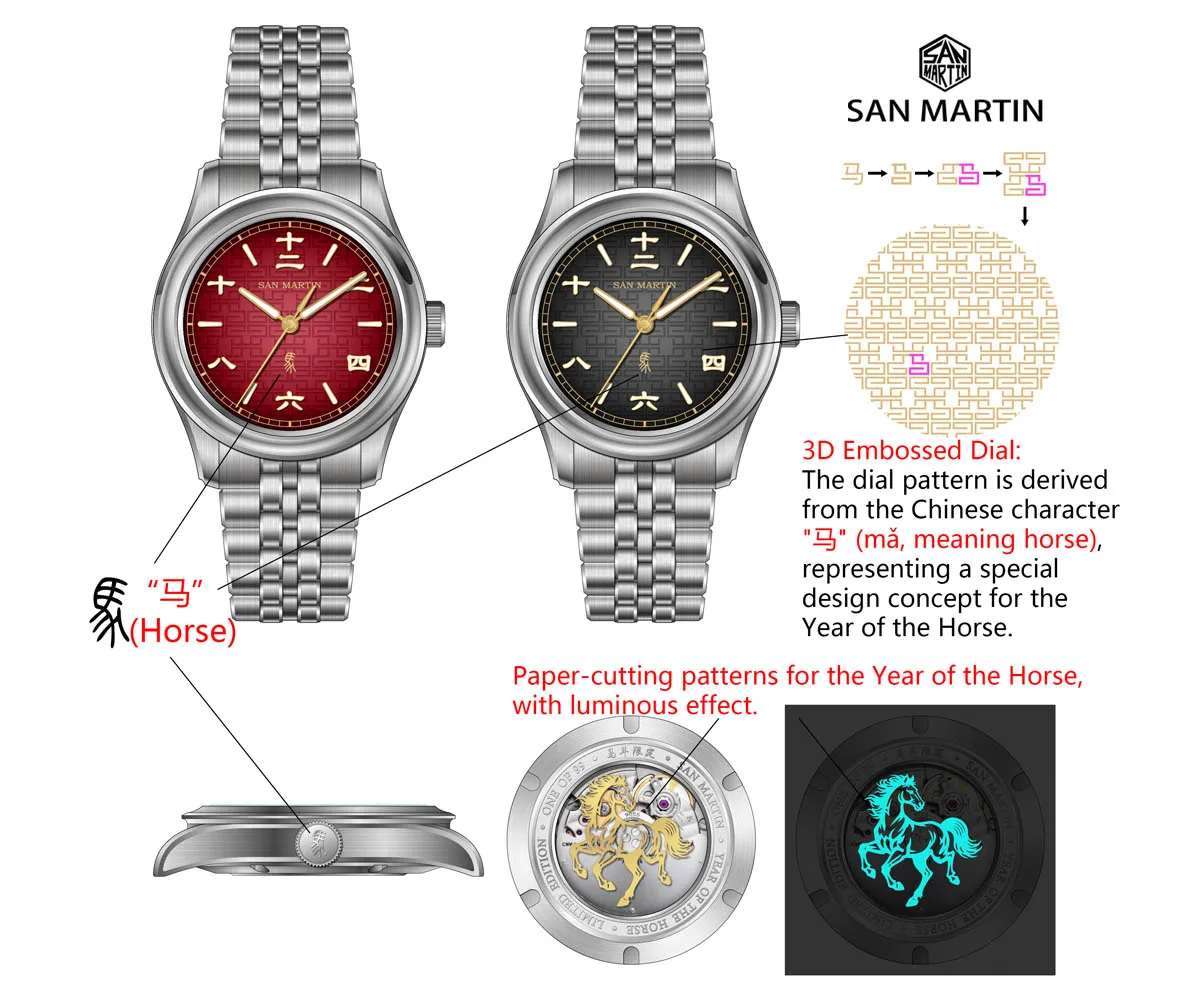 Dial Color: 3D Embossed Dial, Lucky Gradient Red, Dark Horse Gradient Black, Printed SAN MARTIN Logo, Applied Chinese Character Indices